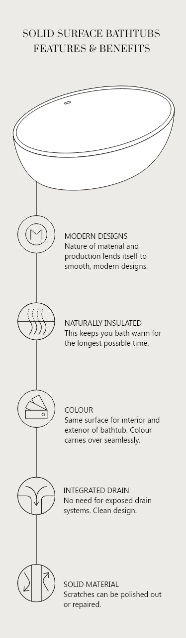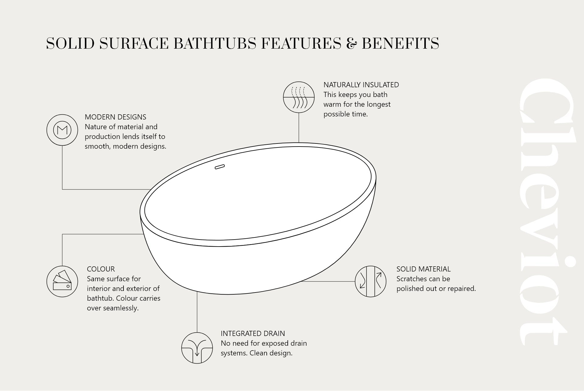 The solid-surface body retains heat for longer, ensuring a consistently comfortable soak, and its smooth, non-porous finish resists stains, scratches, and fading for effortless maintenance. With its low, elongated profile and subtle proportions, the Genoa brings quiet sophistication and tactile comfort to any design palette.